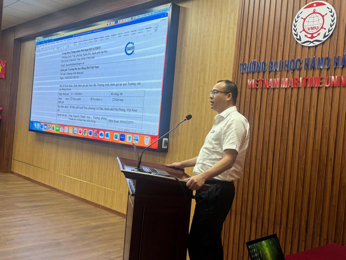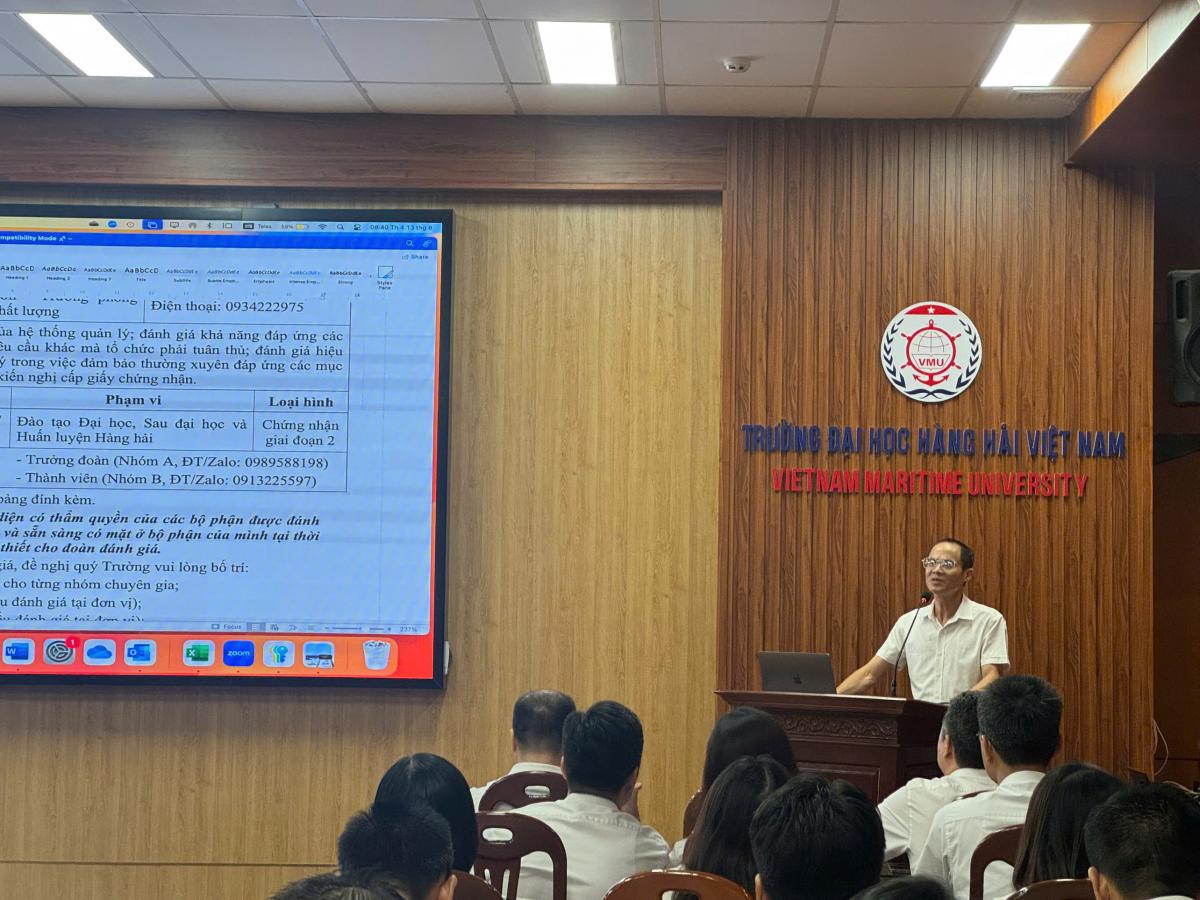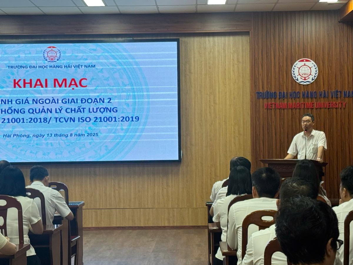 Vào lúc 8 giờ 30 phút ngày 13 tháng 8 năm 2025, tại phòng 3.1, nhà A1, Trường Đại học Hàng hải Việt Nam đã tổ chức phiên họp khai mạc đợt đánh giá ngoài giai đoạn 2 hệ thống quản lý chất lượng theo tiêu chuẩn ISO 21001:2018/TCVN 21001:2019. Phiên họp do PGS. TS Nguyễn Minh Đức – Phó Hiệu trưởng Nhà trường chủ trì, với sự tham dự của ông Lê Vũ Soái – Trưởng đoàn đánh giá, ông Phạm Mạnh Cường – thành viên đoàn thuộc Trung tâm chứng nhận phù hợp QUACERT, cùng đại diện lãnh đạo và cán bộ phụ trách ISO của 39 đơn vị trong Hệ thống quản lý chất lượng của Nhà trường.